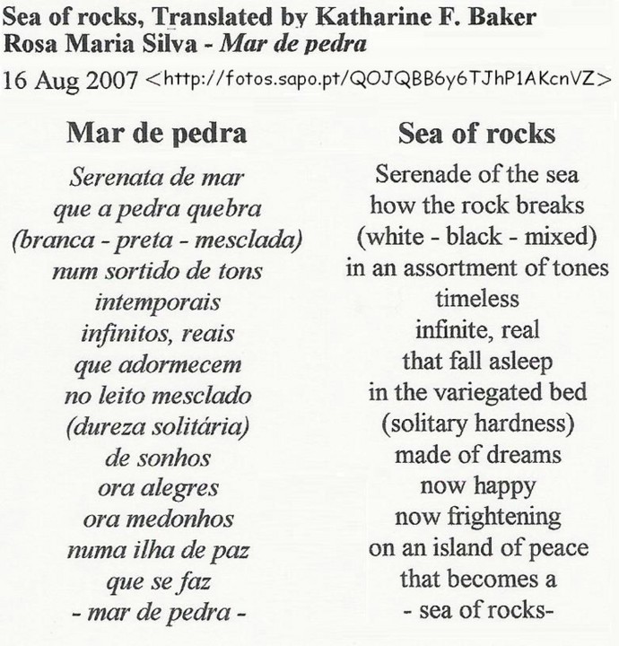 Muito prazer em conhecê-los em 1º de Maio de 2008 em Angra!!! Fico contente ao saber que gostas da tradução inglesa do teu lindo poema "Mar de pedra".