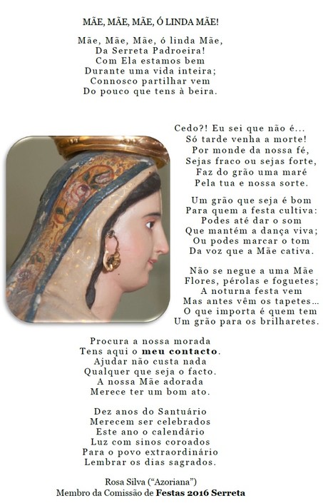 Nota posterior: 2016/09/29. A Festa da Senhora dos Milagres da Serreta 2016 foi um sucesso. Teve a participação de muitos fiéis e recebeu donativos vários. Agradecemos a toda a população residente e emigrante pela generosa partilha e/ou presença festiva. Que a Senhora dos Milagres recompense a todos que de uma forma ou outra abrilhantaram a grandiosa festa da Serreta e sua padroeira. O importante é continuarmos a dizer: Mãe, Mãe, Mãe, ó linda Mãe!